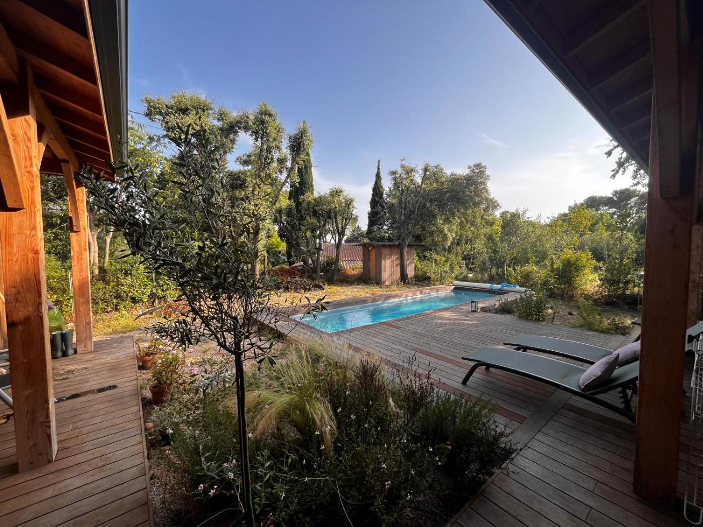 Located in Villevieille, Villa en bois provides accommodation with a private pool, a balcony and garden views. The property is33 km from Zenith Sud Montpellier, 33 km from Odysseum Shopping Centre and 37 km from The Corum. There is a terrace and guests can make use of free WiFi, free private parking and an electric vehicle charging station.